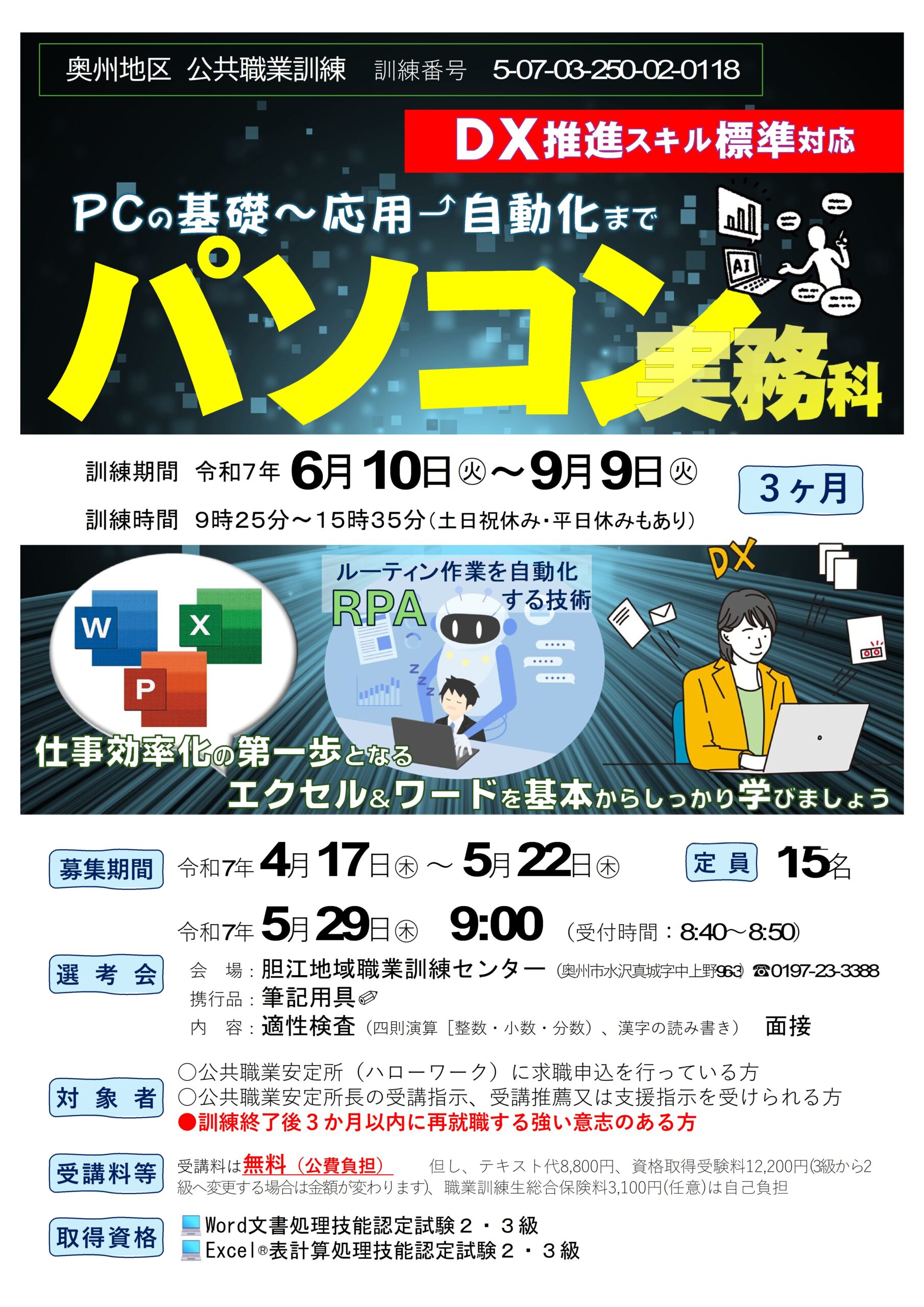 | コース名:基礎から応用 AIまで パソコン実務科 募集期間:8/21(木)~9/25(木) 訓練説明会:9/19(金)14:00 訓練期間:10/15(水)~1/14(水)の3月間 訓練時間:9:25~15:35 | ![]() |