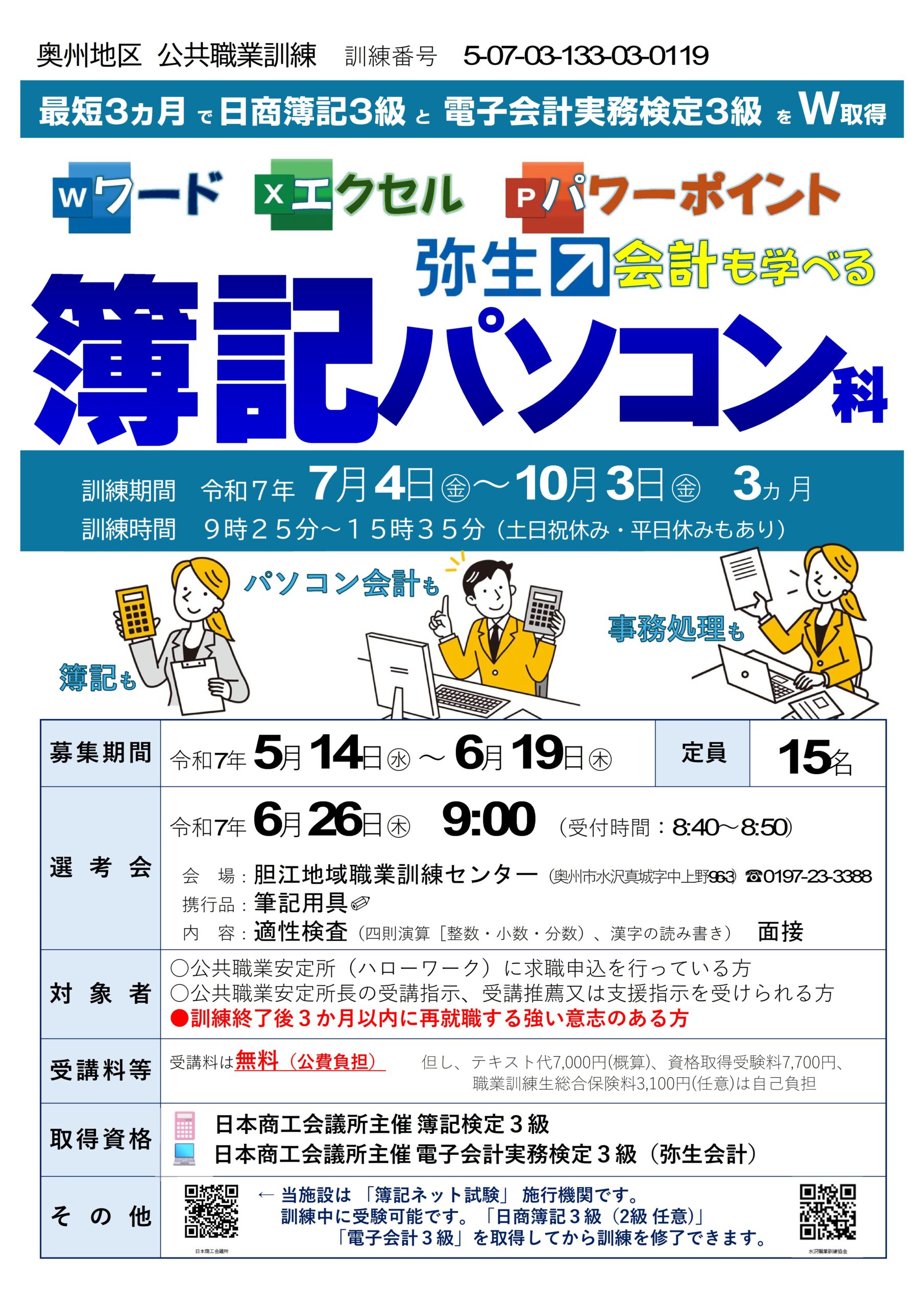 | コース名:ワード、エクセル、パワーポイント、 弥生会計も学べる簿記パソコン科 募集期間:5/14(水)~6/19(木) 訓練説明会:6/16(月)14:00 訓練期間:7/4(金)~10/3(金)の3月間 訓練時間:9:25~15:35 | ![]() |