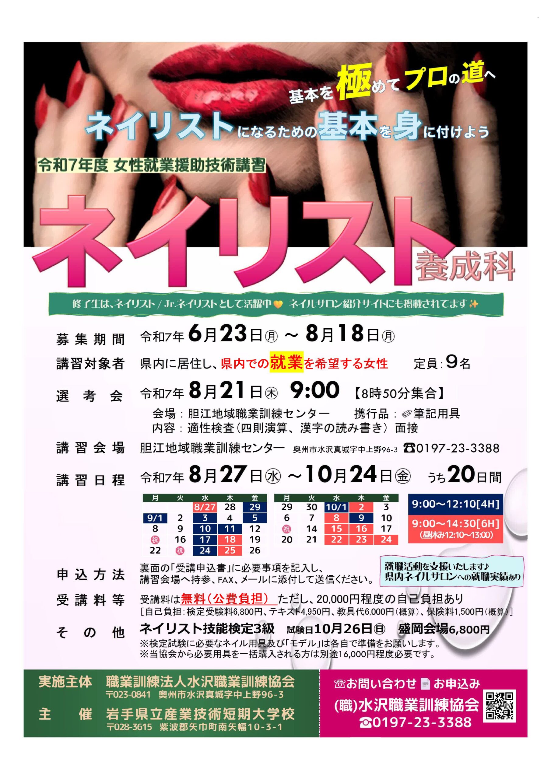 | コース名:ネイリスト養成科 募集期間:6/23(月)~8/18(月) 訓練期間:8/27(水)~10/24(金)のうちの 20日間 週1~3回程度 訓練時間:9:00~14:30(12:10の時もあり) 申込方法:当協会に受講申込書を提出ください。 | ![]() |