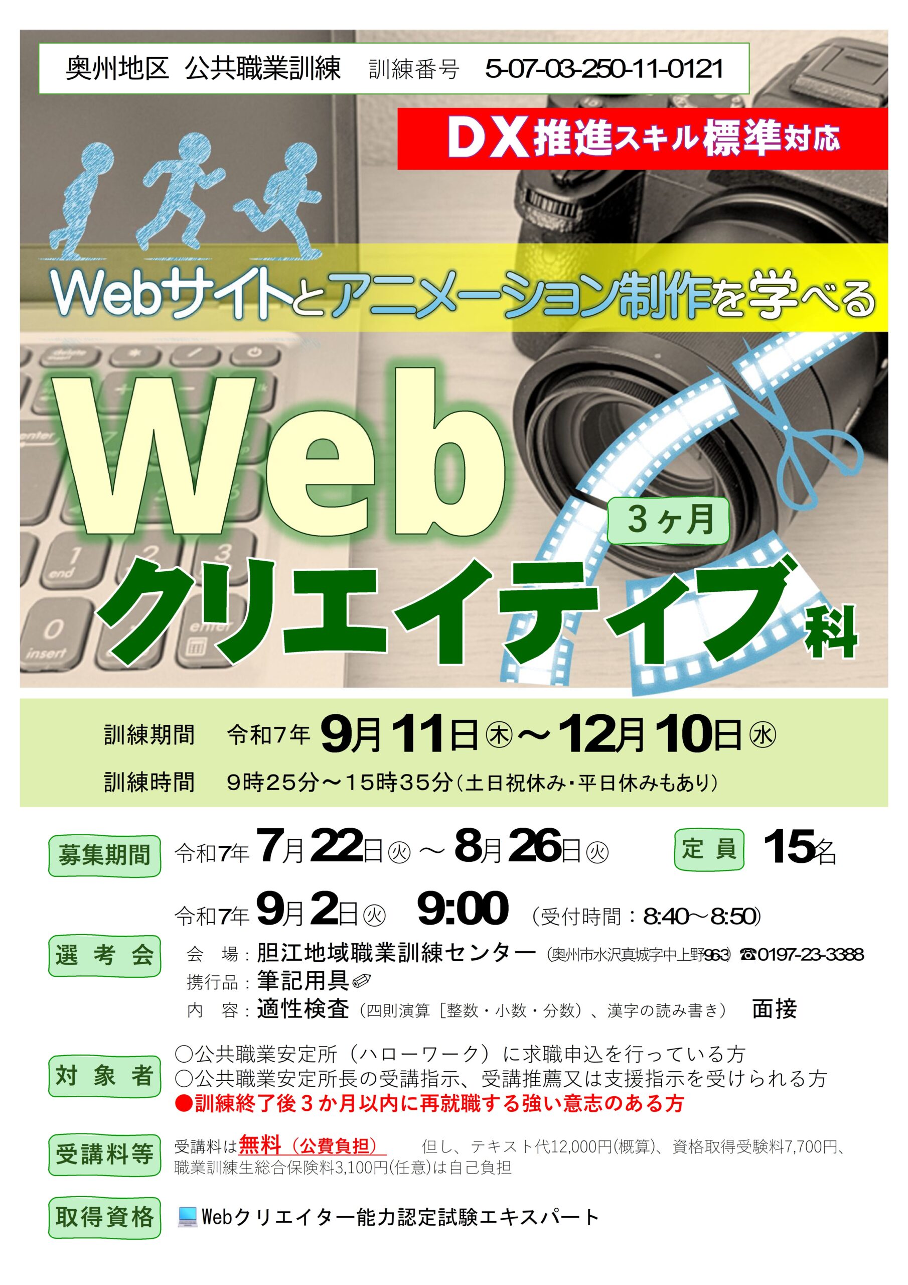 | コース名:Webサイトとアニメーション制作を学 べるWebクリエイティブ科 募集期間:7/22(火)~8/26(火) 訓練説明会:8/21(木)14:00 訓練期間:9/11(木)~12/10(水)の3月間 訓練時間:9:25~15:35 | ![]() |