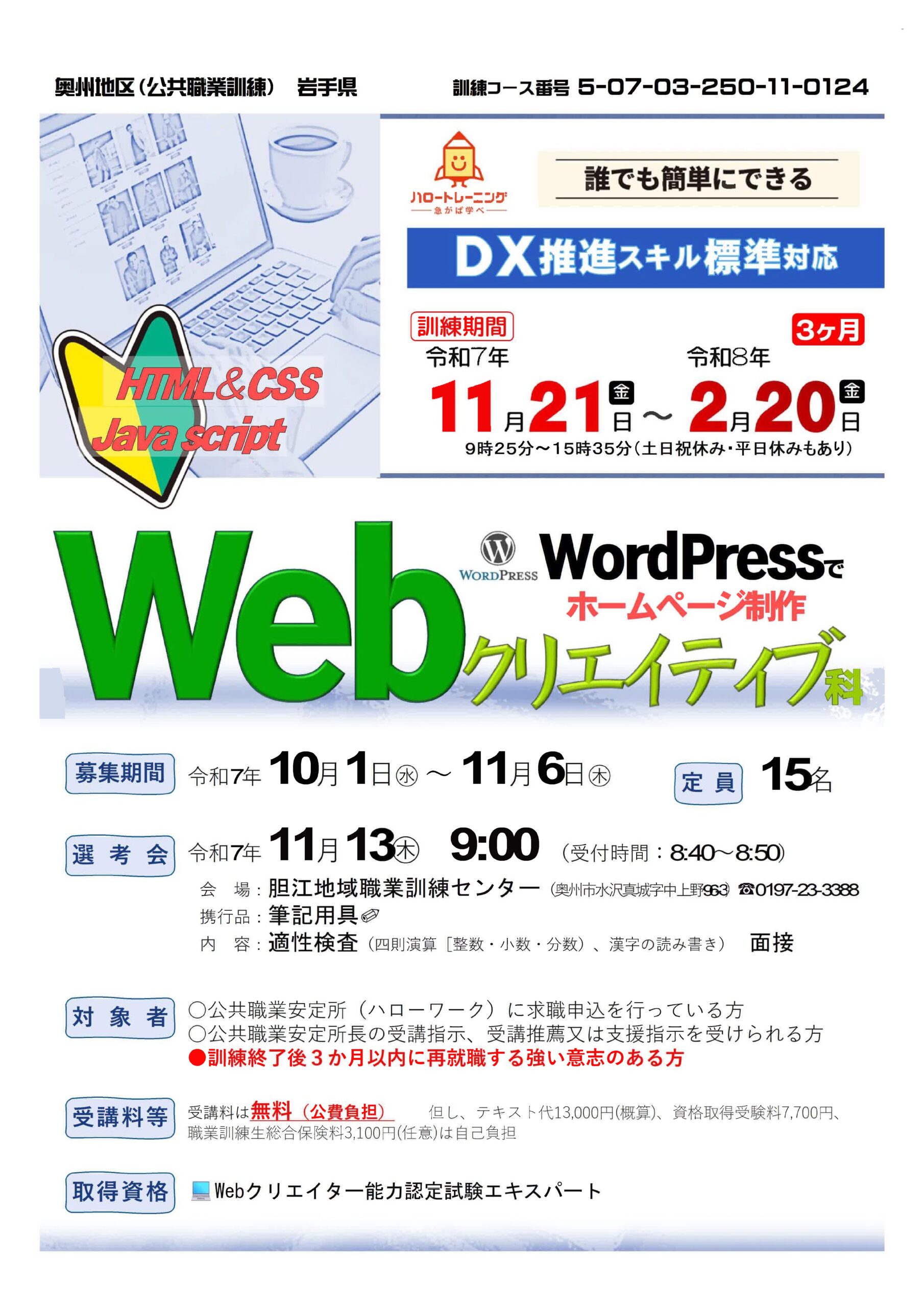 | コース名:WordPressでホームページ作成 Webクリエイティブ科 募集期間:10/1(水)~11/6(木) 訓練説明会:8/21(木)14:00 訓練期間:11/21(金)~2/20(金)の3月間 訓練時間:9:25~15:35 | ![]() |