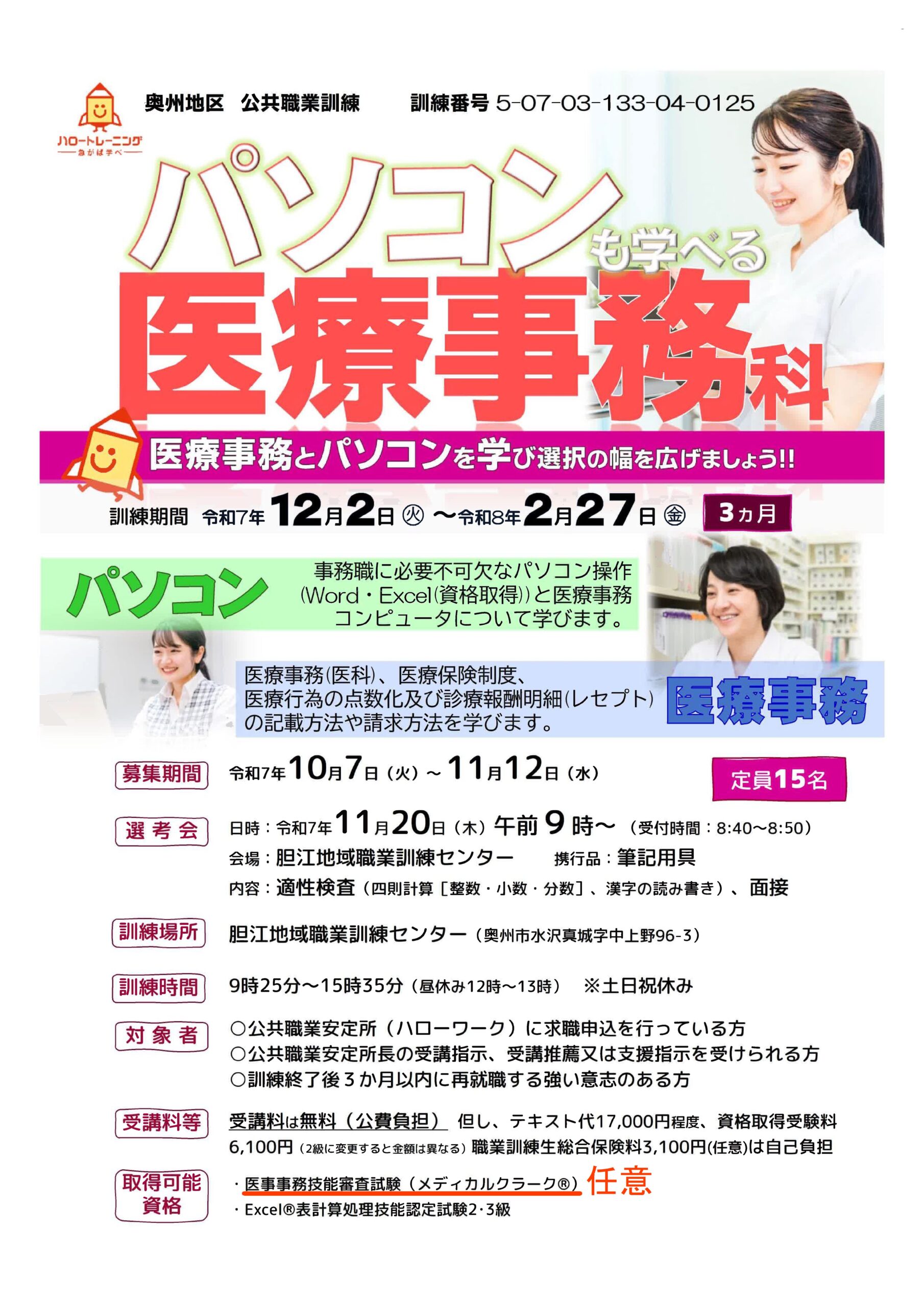 | コース名:パソコンも学べる医療事務科 募集期間:10/7(火)~11/12(水) 訓練説明会:11/7(金)14:00 訓練期間:12/2(火)~2/27(金)の3月間 訓練時間:9:25~15:35 | ![]() |