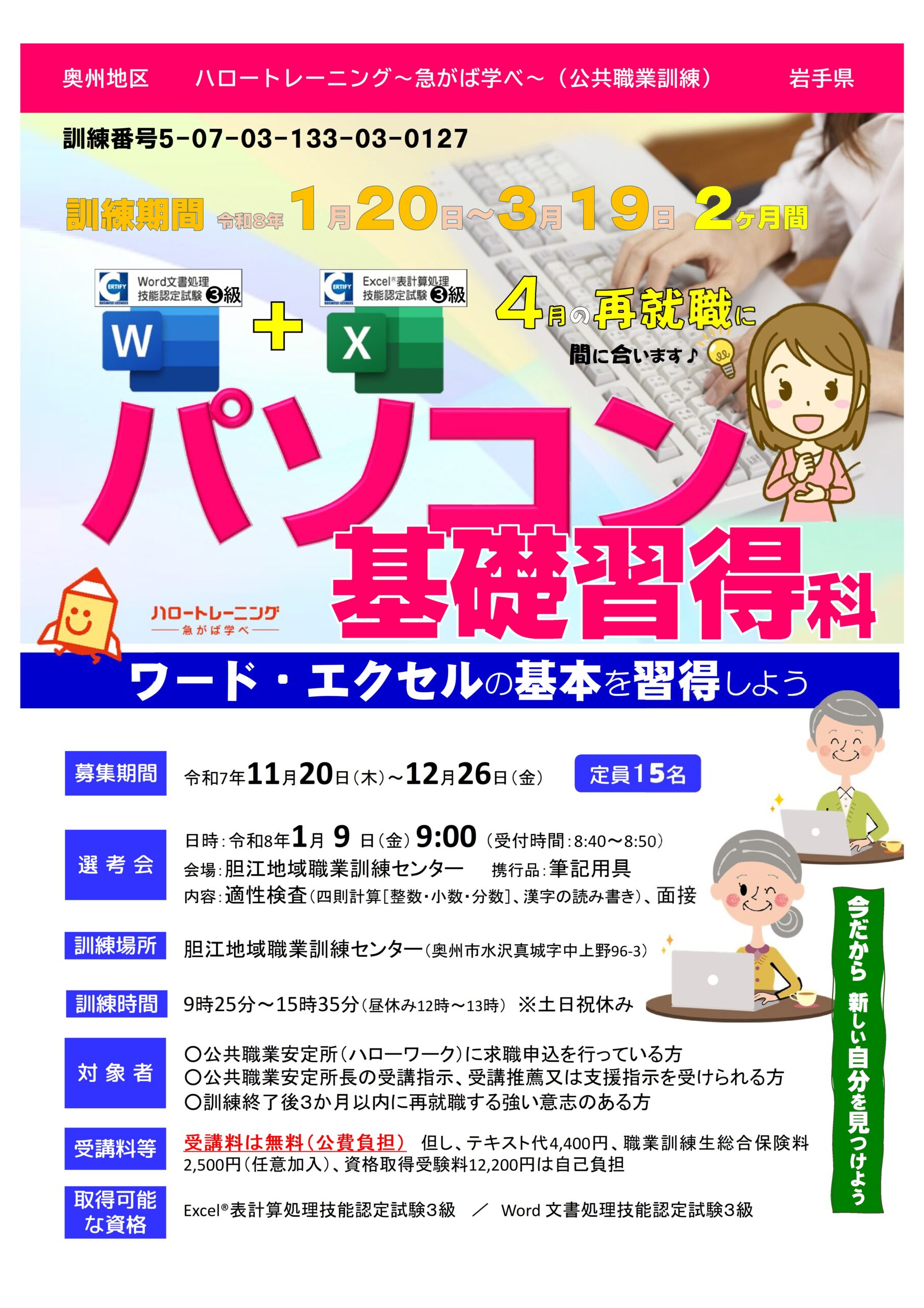 | コース名:ワード・エクセルの基本を習得しよう パソコン基礎習得科 募集期間:11/20(木)~12/26(金) 訓練説明会:12/23(火)14:00 訓練期間:1/20(火)~3/19(木)の2月間 訓練時間:9:25~15:35 | ![]() |