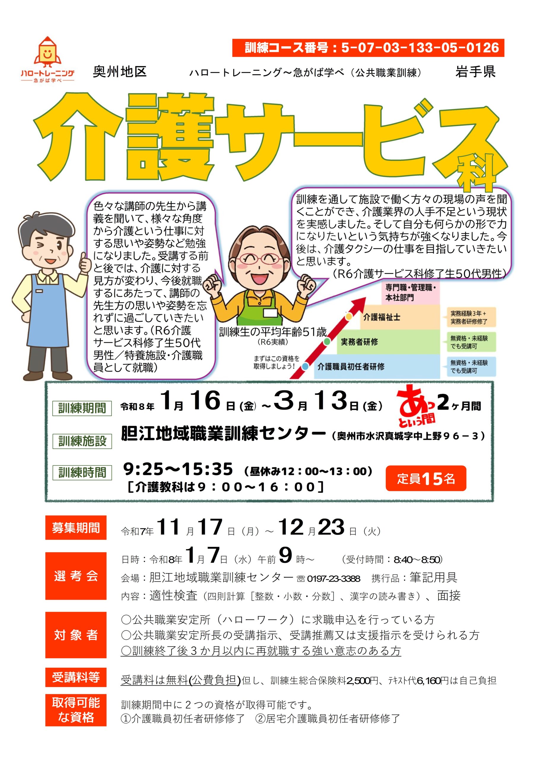 | コース名:介護サービス科 募集期間:11/17(月)~12/23(火) 訓練説明会:12/18(木)14:00 訓練期間:1/16(金)~3/13(金)の2月間 訓練時間:9:00~16:00(9:25~15:35) | ![]() |