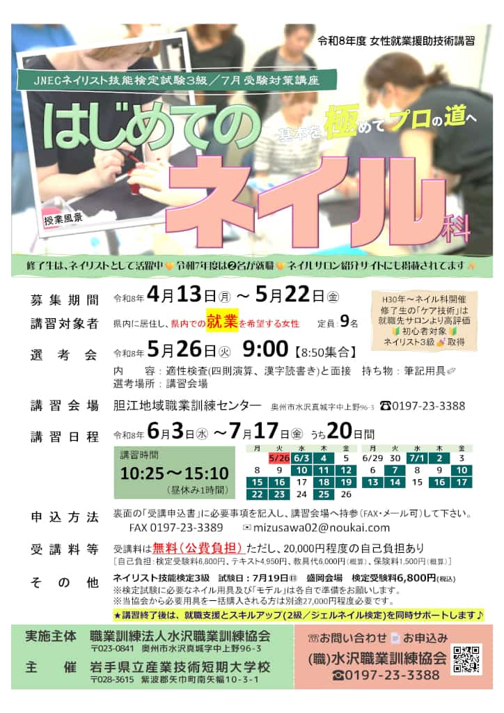 | コース名:はじめてのネイル科 募集期間:4/13(月)~5/22(金) 講習期間:6/3(月)~7/17(金)の20日間 訓練時間:10:25~15:10 申込方法:募集期間内に当協会へ受講申込書を提出 ください。 | JNECネイリスト技能検定3級7月受験対策講座![]() |