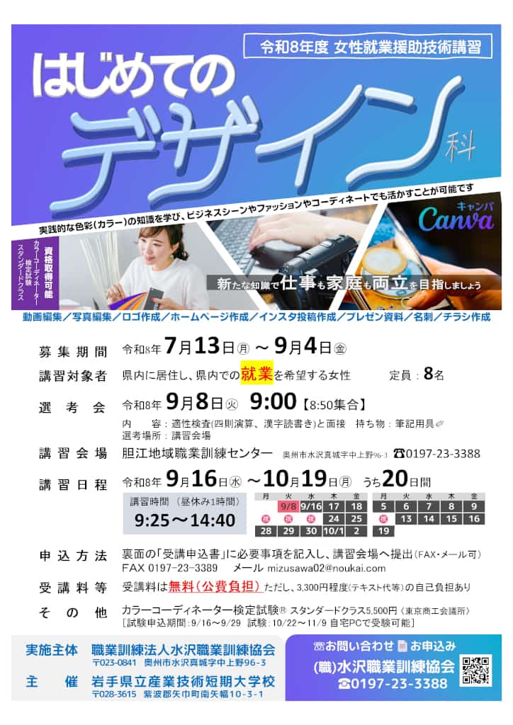 | コース名:パソコン実務科 募集期間:8/24(月)~9/29(火) 訓練説明会:9/18(金)14:00 訓練期間:10/16(金)~R9/1/15(金)の3月間 訓練時間:9:25~15:35 | 準備中 |